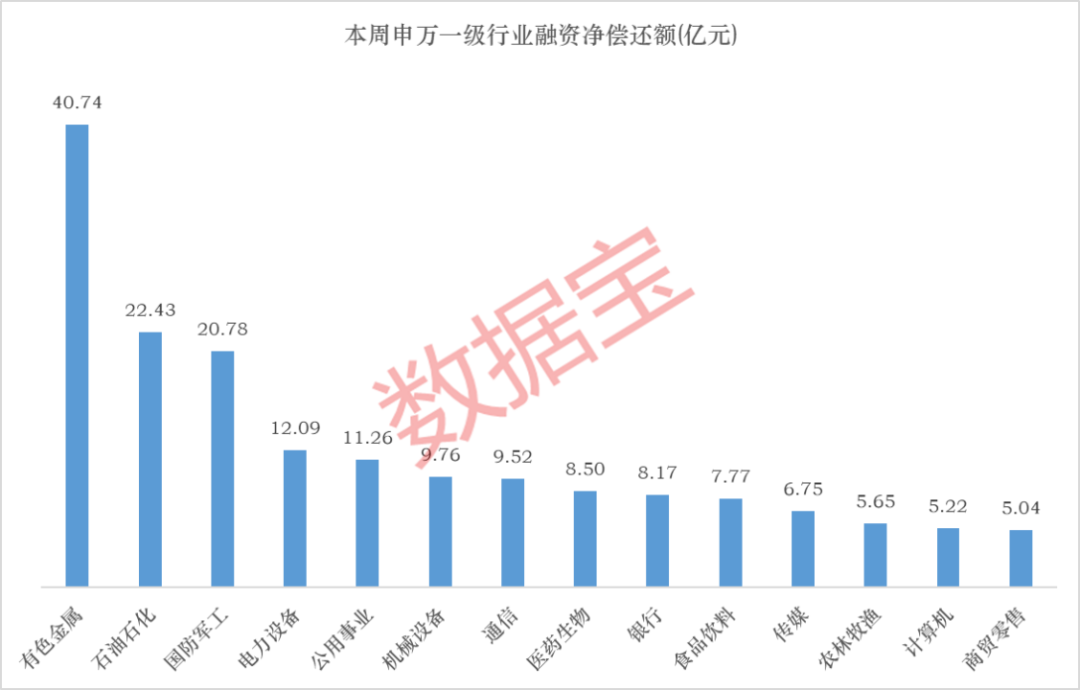 分行业来看,有色金属遥遥领先,融资净偿还额40.74亿元;石油石化、国防军工紧随其后,净偿还额依次为22.43亿元、20.78亿元;电力设备、公用事业分列第四、五位,净偿还额均在10亿元以上。
