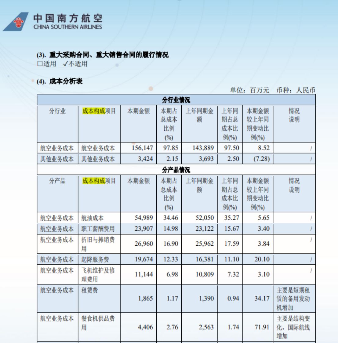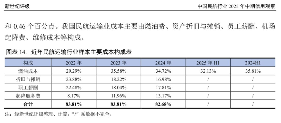 记者查询到,2024年中国国航、中国东航、南方航空的航空油料成本分别为537.20亿元、454.99亿元和549.89亿元,分别占总成本的33.96%、35.97%和34.46%。此外,据《中国民航行业2025年中期信用观察》,2022年—2024年及2025年上半年,民航运输行业样本航油成本占营业成本的比例分别为 29.29%、35.58%、34.72%和 32.13%(半年度不含华夏航空)。