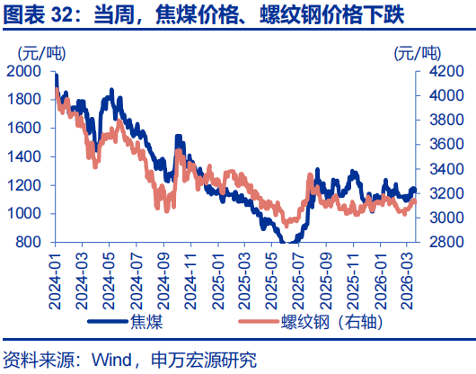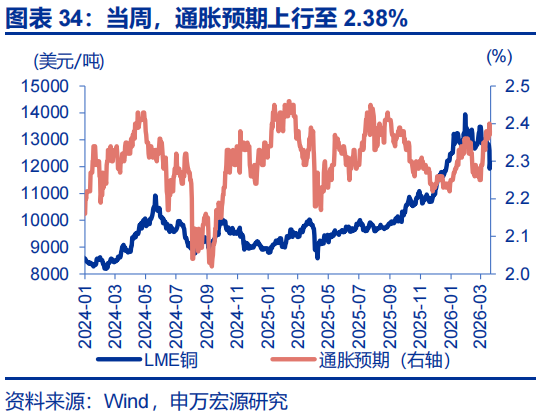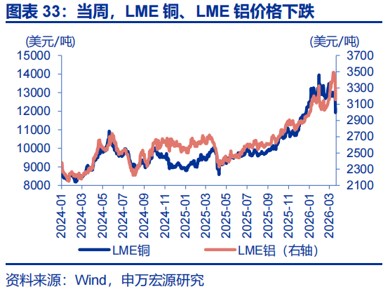 当周,有色金属价格悉数下跌、贵金属价格悉数下跌。LME铝下跌5.7%至3287美元/吨,LME铜下跌5.6%至12128美元/吨;通胀预期上行2bp至2.38%;COMEX银价格下跌12.7%至69.5美元/盎司,COMEX金价格下跌8.9%至4576.3美元/盎司;10Y美债实际收益率上行9bp至2.01%。