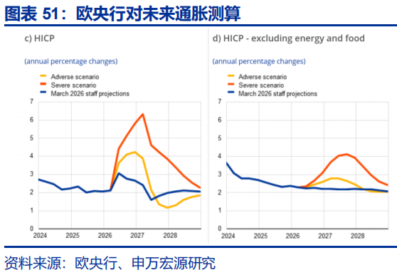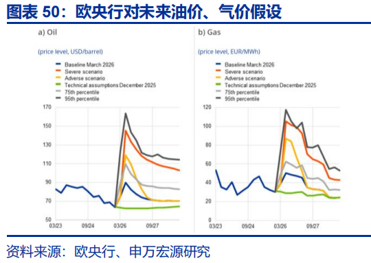 声明指出,中东战争推升欧元区通胀,对经济形成下行风险。根据欧央行声明,冲突显著增加了经济不确定性,通过推高能源价格对短期通胀产生重大影响。欧央行基准预测将2026年实际GDP增速下修至0.9%,HICP通胀和核心HICP通胀分别大幅上调至2.6%、2.2%。中东局势的中期影响将取决于冲突强度、持续时间,以及能源价格的影响(间接/第二轮影响)。