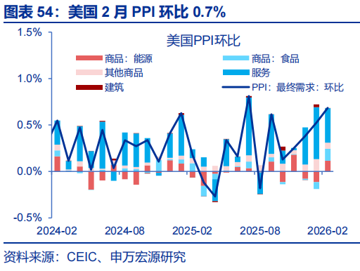 美国2月PPI同比3.4%,环比0.7%,市场预期环比为0.3%,前值0.5%。从环比驱动结构来看,2月PPI环比提升的主要动力来自于能源、食品分项,服务分项涨幅有所缩窄。在服务行业中,零售贸易、信息业、证券、主题公园、住宿等行业环比提升,显示劳动力/运营成本压力仍较大。