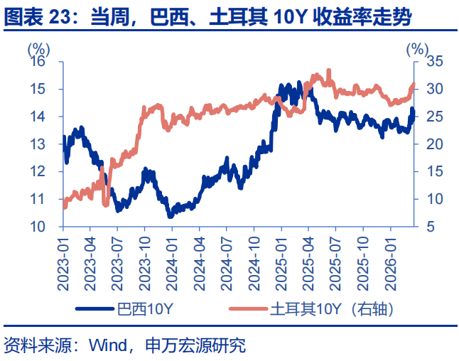 当周,新兴市场10年期国债收益率多数上行。土耳其上行46.0bp至30.99%,巴西下行11.5bp至14.20%,越南上行0.6bp至4.34%,南非上行12.0bp至9.05%,泰国上行5.5bp至2.09%,印度上行5.0bp至6.73%。