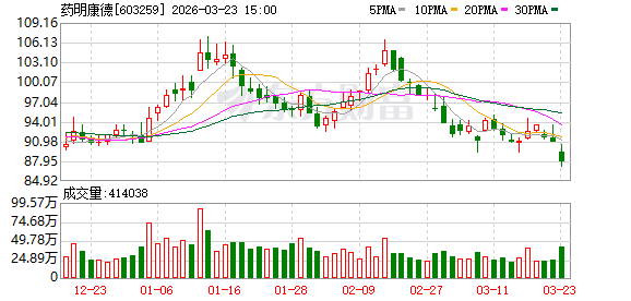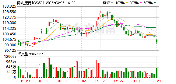 截至3月23日收盘,药明康德A股报87.79元/股,跌3.42%,市值2619.4亿元;港股报102.7港元/股,跌4.02%,市值3064.3亿港元。