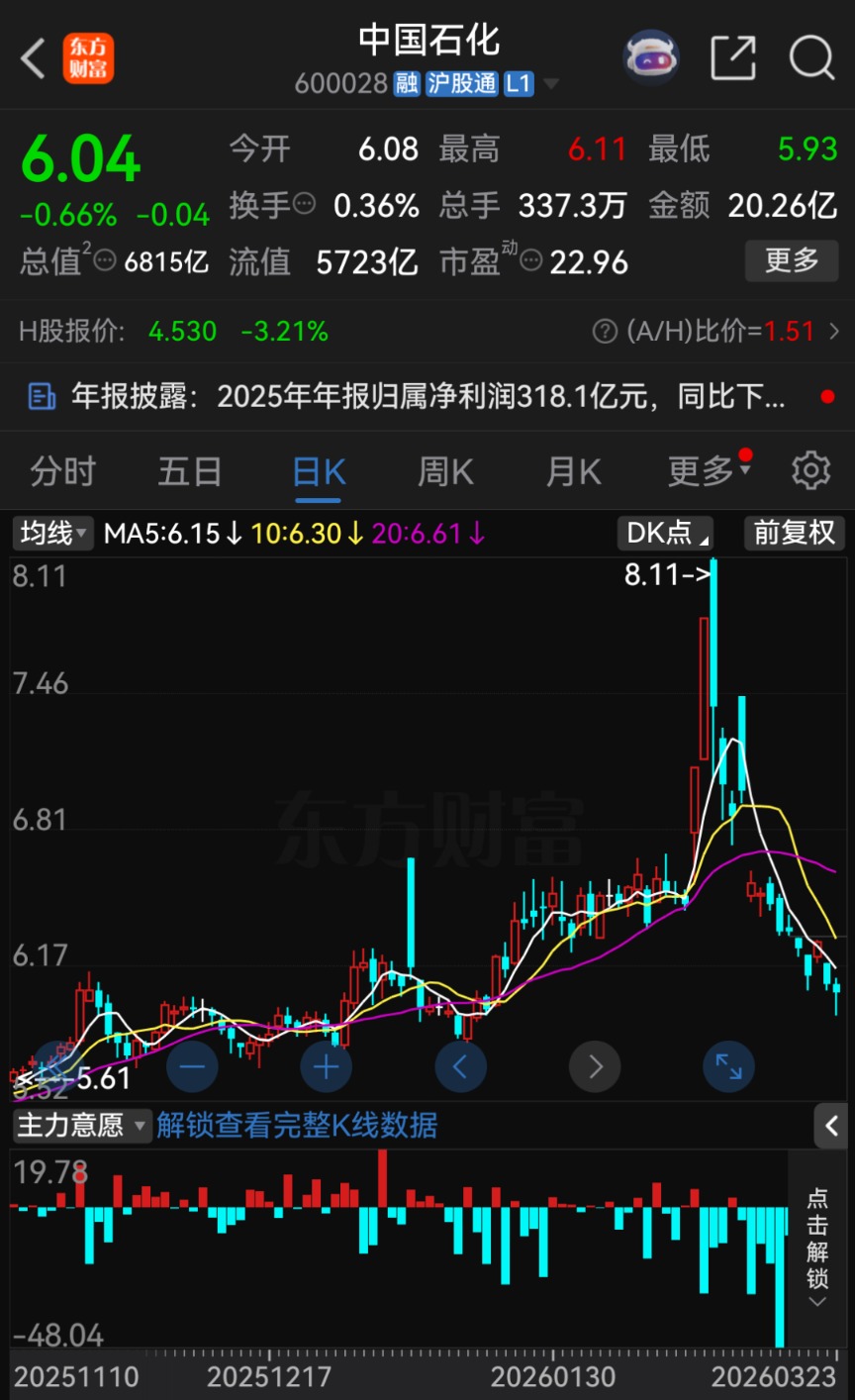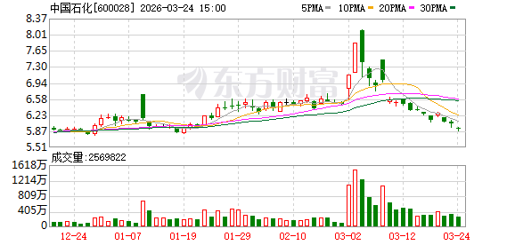 3月23日收盘,中国石化A股股价报6.04元/股,总市值达6815亿元。