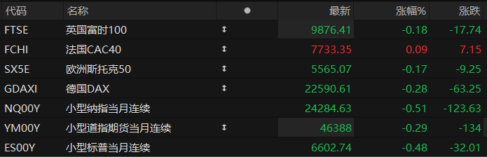 周二盘前,美股三大股指期货齐跌,欧洲主要指数多数下跌。截至发稿,纳斯达克100指数期货跌0.51%,道指期货跌0.29%,标普500指数期货跌0.48%。