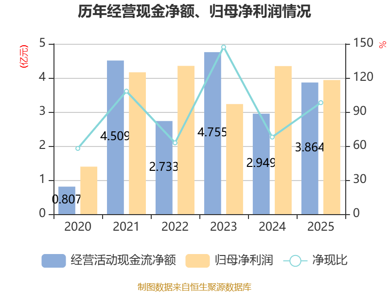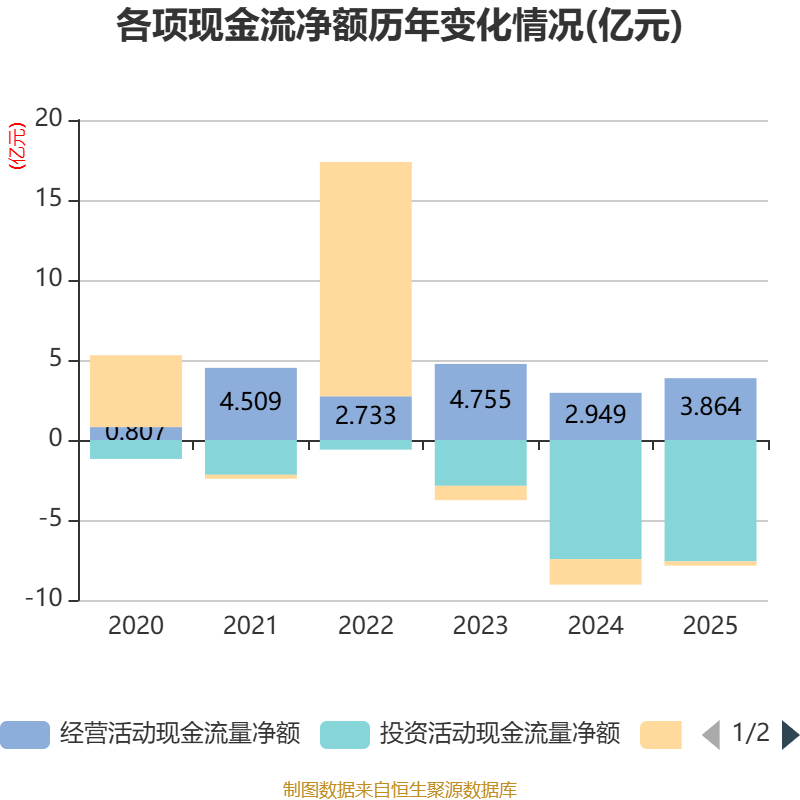 截至2025年,公司经营活动现金流净额为3.86亿元,同比增长31.04%;筹资活动现金流净额-2703.42万元,同比增加1.33亿元;投资活动现金流净额-7.58亿元,上年同期为-7.44亿元。