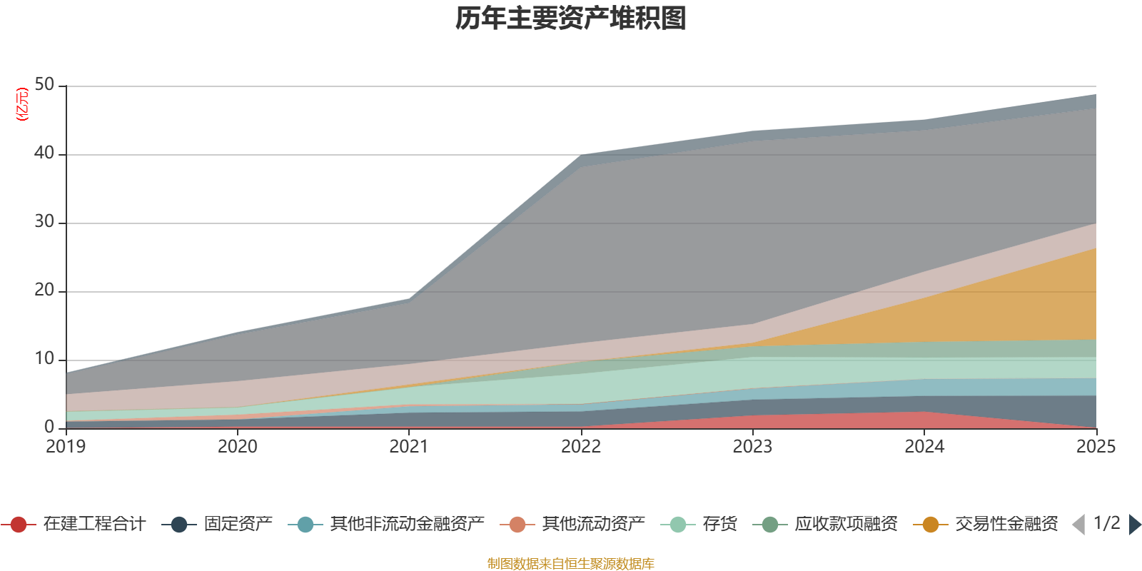 资产重大变化方面,截至2025年末,公司交易性金融资产合计较上年末增加107.26%,占公司总资产比重上升13.07个百分点;货币资金较上年末减少18.83%,占公司总资产比重下降11.46个百分点;在建工程合计较上年末减少96.8%,占公司总资产比重下降5.22个百分点;固定资产较上年末增加103.94%,占公司总资产比重上升4.52个百分点。