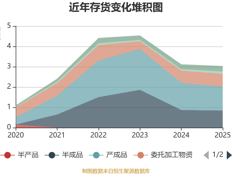 从存货变动来看,截至2025年末,公司存货账面价值为3.03亿元,占净资产的7.01%,较上年末减少848万元。其中,存货跌价准备为3840.84万元,计提比例为11.25%。