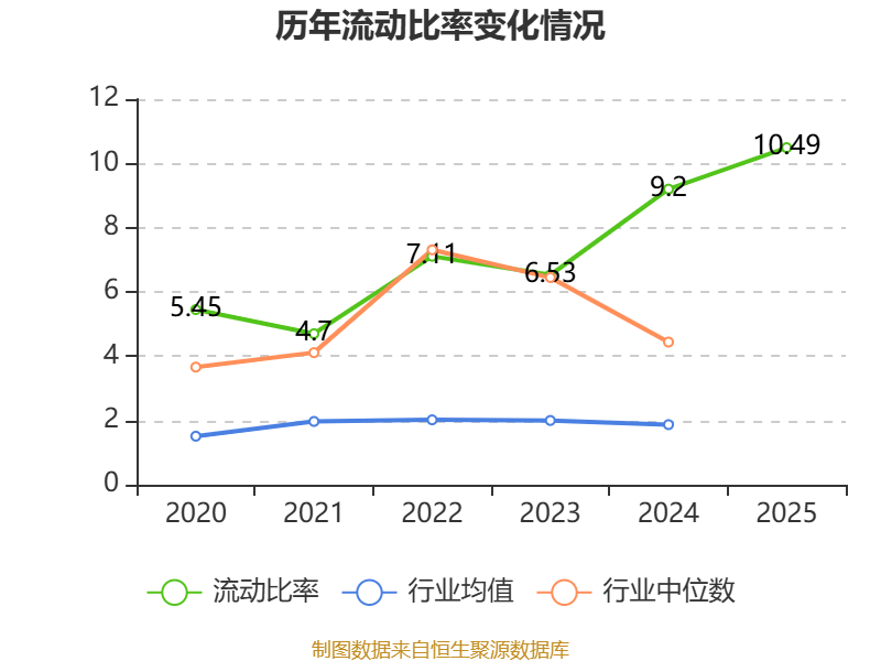 2025年,公司流动比率为10.49,速动比率为9.69。