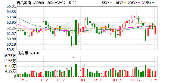 据大智慧VIP,截至3月26日收盘,青岛啤酒报62.20元/股,跌0.75%;港股青岛啤酒股份报48.64港元/股,跌1.62%。