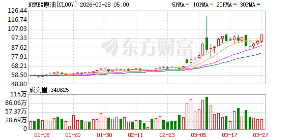 商品市场:国际油价03月27日上涨。截至当天收盘,纽约商品交易所WTI原油期货当月连续合约上涨6.70美元,收于每桶101.18美元,涨幅为7.09%。COMEX黄金期货当月连续合约上涨113.40美元,涨幅2.59%,报4489.7美元/盎司。COMEX白银期货当月连续合约上涨1.84美元,涨幅2.70%,报69.77美元/盎司。现货黄金上涨113.93美元,涨幅2.60%,报4492.74美元/盎司。现货白银上涨1.74美元,涨幅2.56%,报69.71美元/盎司。