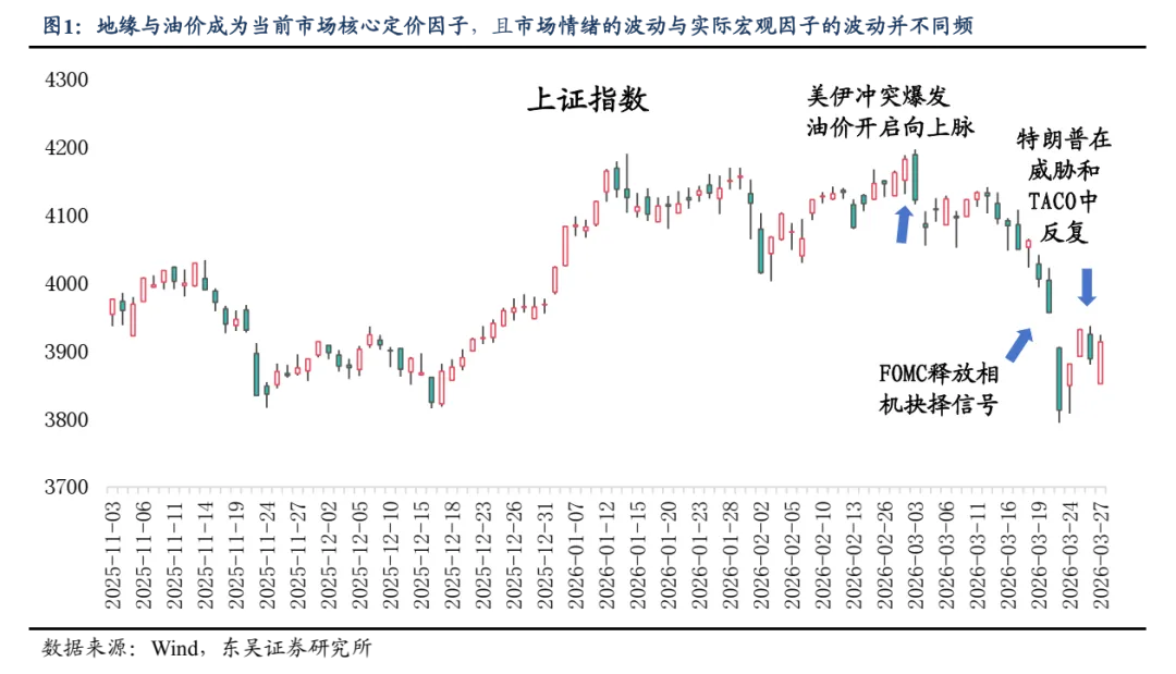 地缘冲突取代AI产业逻辑,成为市场当下核心定价因子。2月28日美伊战争爆发以来油价进入上行趋势,全球风险资产波动放大,演绎方向与油价大致相反。从市场反馈看,目前市场情绪的波动明显与实际宏观因子的波动并不同频。“TACO”信号的反复以及美伊以三方信息的矛盾冲突主导油价的短期脉冲,使得市场对于油价长期中枢位置以及海外走向滞胀或衰退的概率难有稳定预期。复盘3月以来A股表现,月初整体仓位偏高、市场对油价中枢抬高风险反馈并不充分,月中旬开始后知后觉延迟计价,FOMC的“相机抉择”态度加速了这一进程,再到本周一特朗普的“48小时”最后通牒触发市场将悲观预期非线性外推,出现短线超卖的非理性定价。而战争真正的烈度演绎和持续时间、霍尔木兹海峡的通航情况、是否/何时谈判以及谈判中双方的拉锯均不可准确预判,也导致市场无法即时、有效的定价本次地缘影响,故在本周一之后,市场的修复节奏与结构均较为混乱。