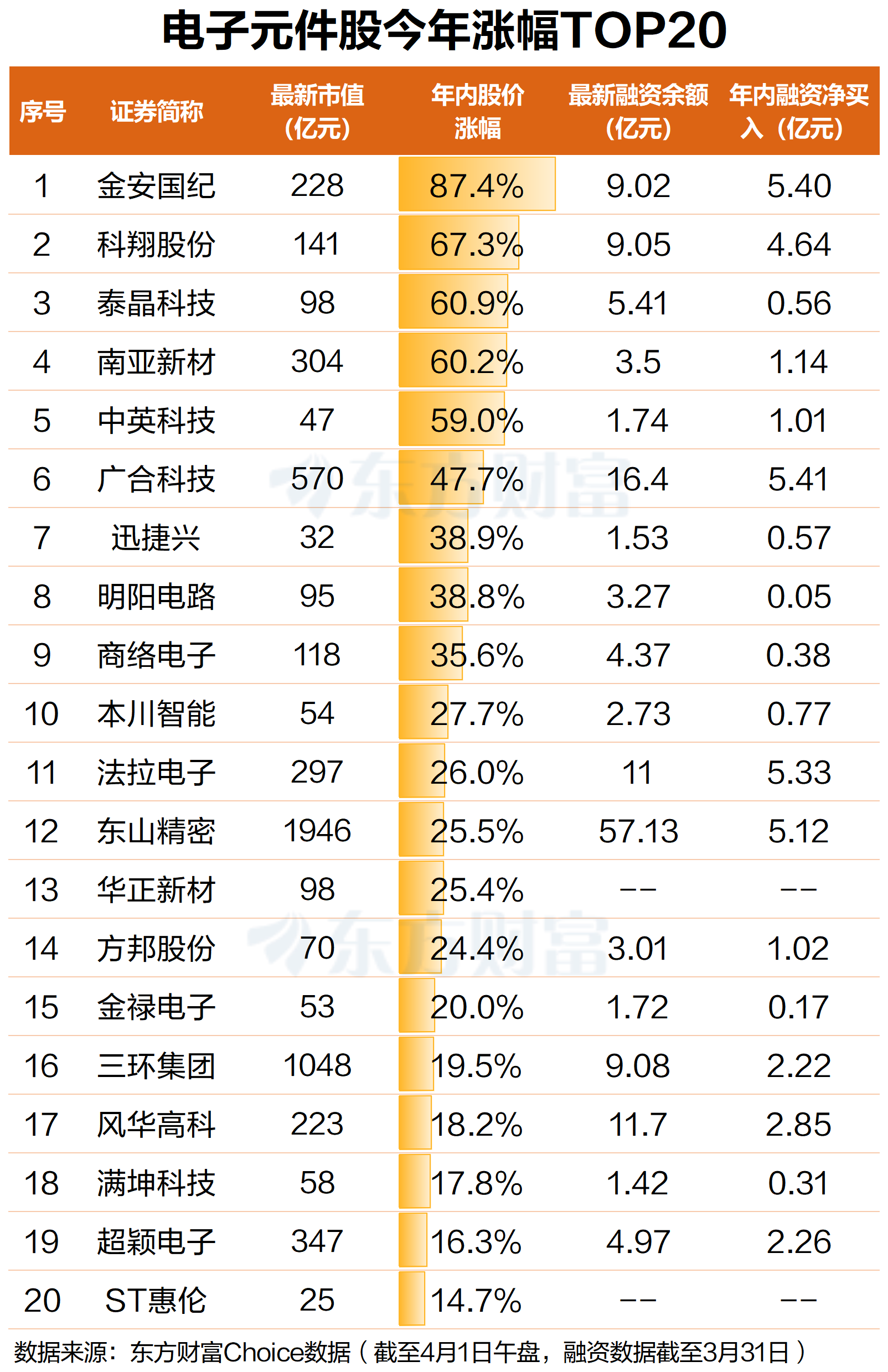 A股方面,电子元件股整体表现向好,62只成份股中今年有40只上涨,涨幅中位数为8.62%。其中,金安国纪年内涨幅最大,达87.4%;科翔股份、泰晶科技、南亚新材、中英科技涨幅居前,年内均大涨约60%。此外,广合科技、迅捷兴、明阳电路、商络电子等也均涨超30%。