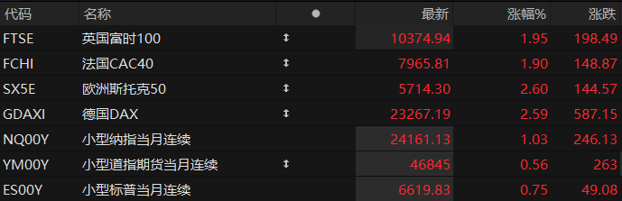 周三盘前,美股三大股指期货齐涨,欧洲主要指数普遍上涨。截至发稿,纳斯达克100指数期货涨1.03%,道指期货涨0.56%,标普500指数期货涨0.75%。