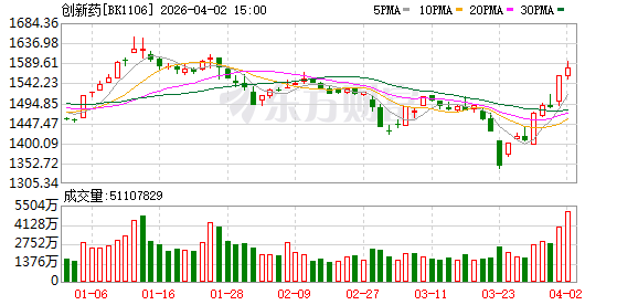 创新药4月1日早盘表现强势,广生堂、睿智医药、润都股份、联环药业、昂利康、万邦德、海王生物涨停。益方生物、苑东生物、舒泰神、必贝特、百利天恒等大涨超10%。3月24日以来,创新药板块指数拉升明显,7个交易日累计涨幅超过15%。