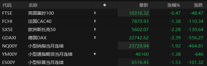 周四盘前,美股三大股指期货齐跌,欧洲主要指数普遍下跌。截至发稿,纳斯达克100指数期货跌1.92%,道指期货跌1.38%,标普500指数期货跌1.53%。