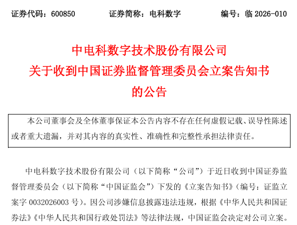 电科数字(600850)4月3日晚间公告,公司于近日收到中国证券监督管理委员会(简称“中国证监会”)下发的《立案告知书》。因公司涉嫌信息披露违法违规,根据《中华人民共和国证券法》《中华人民共和国行政处罚法》等法律法规,中国证监会决定对公司立案。
