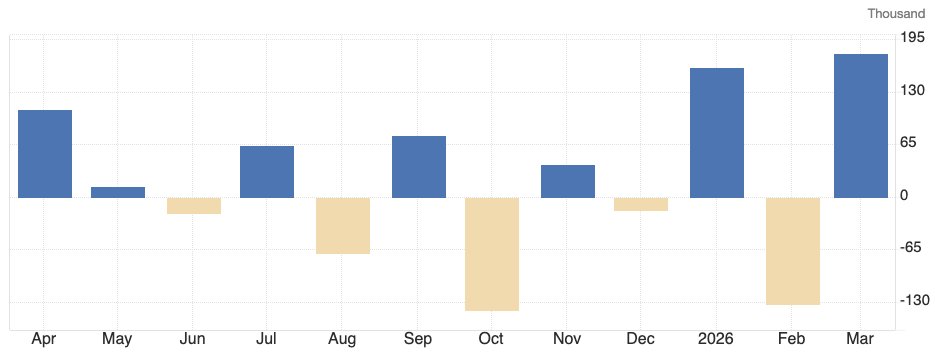 与此同时,美国联邦政府雇员人数在3月进一步下降1.8万人,较2024年10月的高点累计减少35.5万人,相当于总人数的11.8%。金融业的就业也减少1.5万人,较2025年5月高点以来累计减少7.7万人。