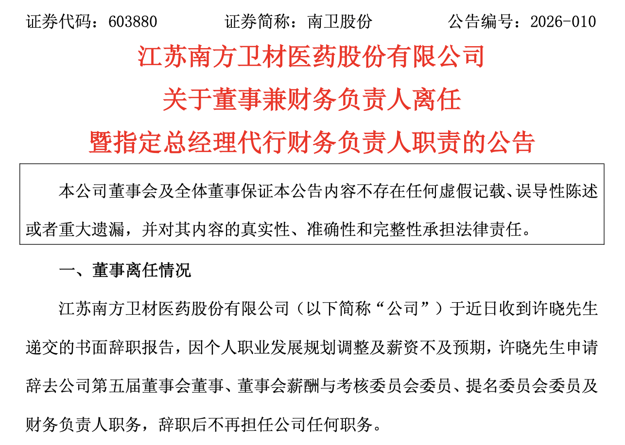 近日,南卫股份(603880)公告,公司董事、财务负责人许晓递交了书面辞职报告,而辞职理由中“薪资不及预期”的直白表述,在A股市场实属罕见。