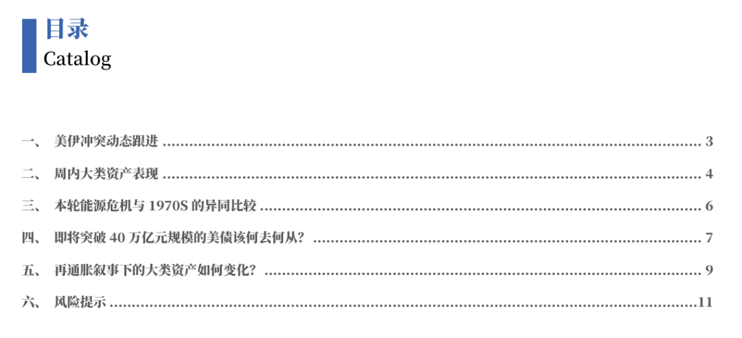本周全球市场波动的核心驱动仍来自中东地缘冲突与能源冲击。伊朗战事持续胶着、霍尔木兹海峡通行受扰,使市场对全球原油供给中断的担忧明显上升,推动WTI原油价格创新高,并带动能源与部分资源品整体上涨,同时也推升潜在通胀预期。这一背景下,贵金属与部分工业金属同步走强。与此同时,能源冲击叠加通胀不确定性,使主要央行对政策转向保持谨慎,美联储官员普遍释放维持利率不变的信号,但美债收益率整体下行。权益市场方面,美国非农就业明显好于预期、科技产业资本运作活跃对市场情绪形成支撑,使欧美股市在周中震荡后实现反弹,而中国权益市场则受到成长板块调整及风险偏好回落影响表现相对偏弱。