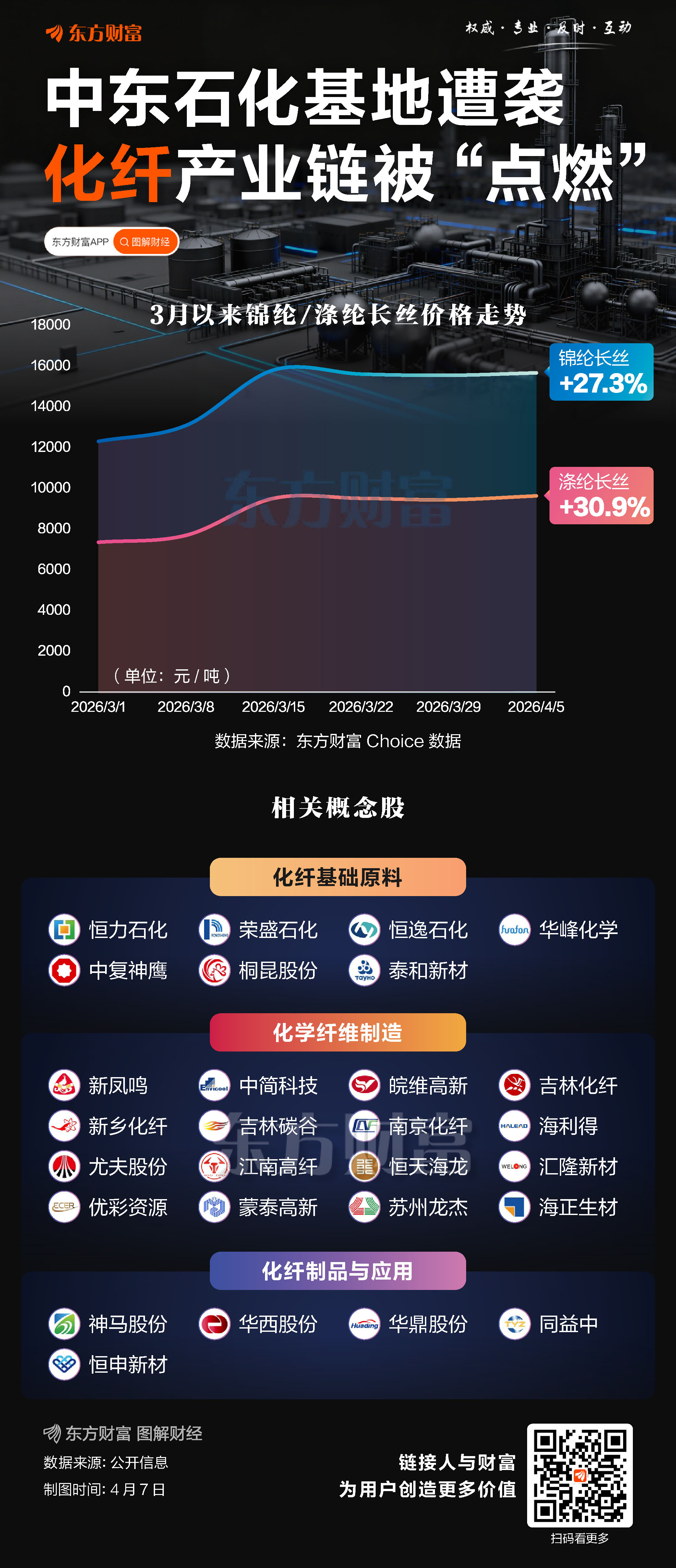 而化纤板块作为石油化工的核心下游,其价格与原油直接挂钩。事实上,美以伊冲突以来,随着原油的上涨,合成纤维的价格已是明显上涨。比如锦纶长丝(POY85D/24F半消光)华东地区主流价最新报15660元/吨,较3月初上涨超过27%;涤纶长丝(POY150D/48F半光黑丝)江浙地区主流价最新报9620元/吨,较3月初上涨超过30%。