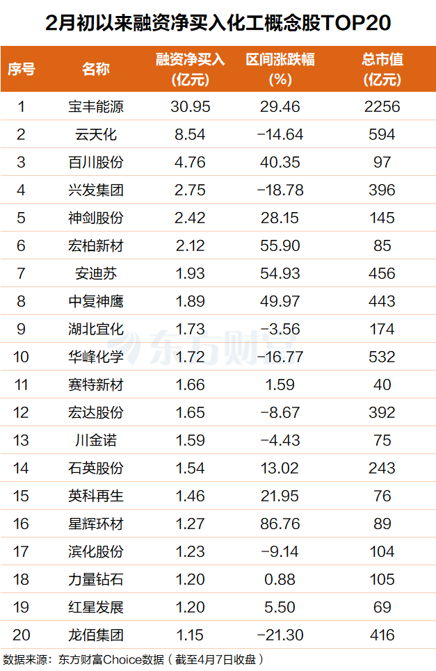 东方财富Choice数据显示,自今年2月初以来,杠杆资金净买入多只化工概念股。其中宝丰能源排名第一,融资净买入超30亿元;云天化排名第二,融资净买入超8亿元。