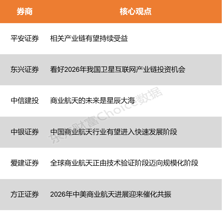 平安证券表示,航空航天作为国家重要新质生产力之一,近几年在政府扶持、技术进步、供应链发展背景下迎来航天发射任务加速。东兴证券指出,“十五五”时期,商业航天将成为国内推动新质生产力和科技高质量发展的重要引擎。为了抢占宝贵的轨道和频谱资源,2026年我国星座卫星发射数量有望进一步加速增长。