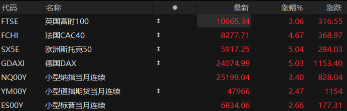 周三盘前,美股三大股指期货齐涨,欧洲主要指数普遍上涨。截至发稿,纳斯达克100指数期货涨3.40%,道指期货涨2.47%,标普500指数期货涨2.66%。
