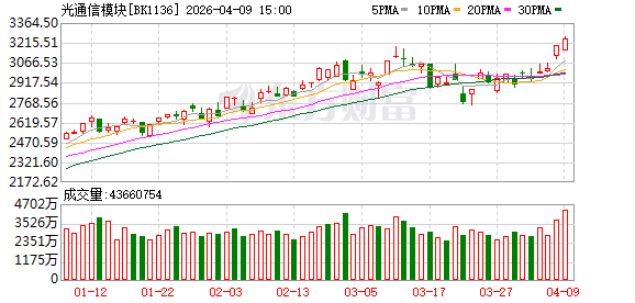 周四(4月9日)光通信概念延续强势,截至午间收盘,光迅科技涨近9%,长芯博创、联特科技、长飞光纤等多股强势跟涨。