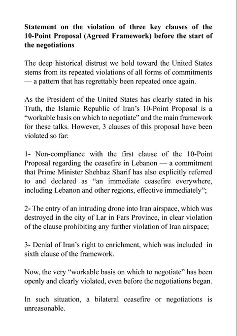 1.“十点计划”中的第一条遭到违反,关于黎巴嫩停火——这一承诺也被巴基斯坦总理夏巴兹·谢里夫明确提及,并宣布“包括黎巴嫩及其他地区在内的所有地方立即停火,并即刻生效”。