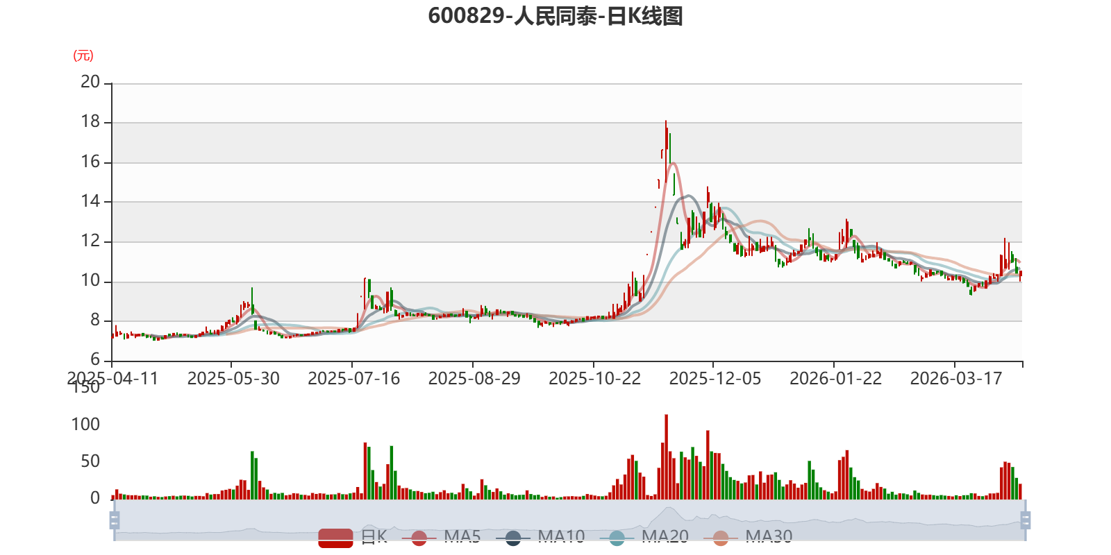 以4月10日收盘价计算,人民同泰目前市盈率(TTM)约为45.54倍,市净率(LF)约2.02倍,市销率(TTM)约0.59倍。