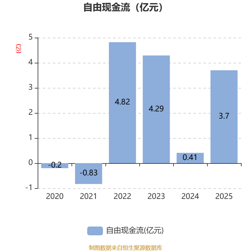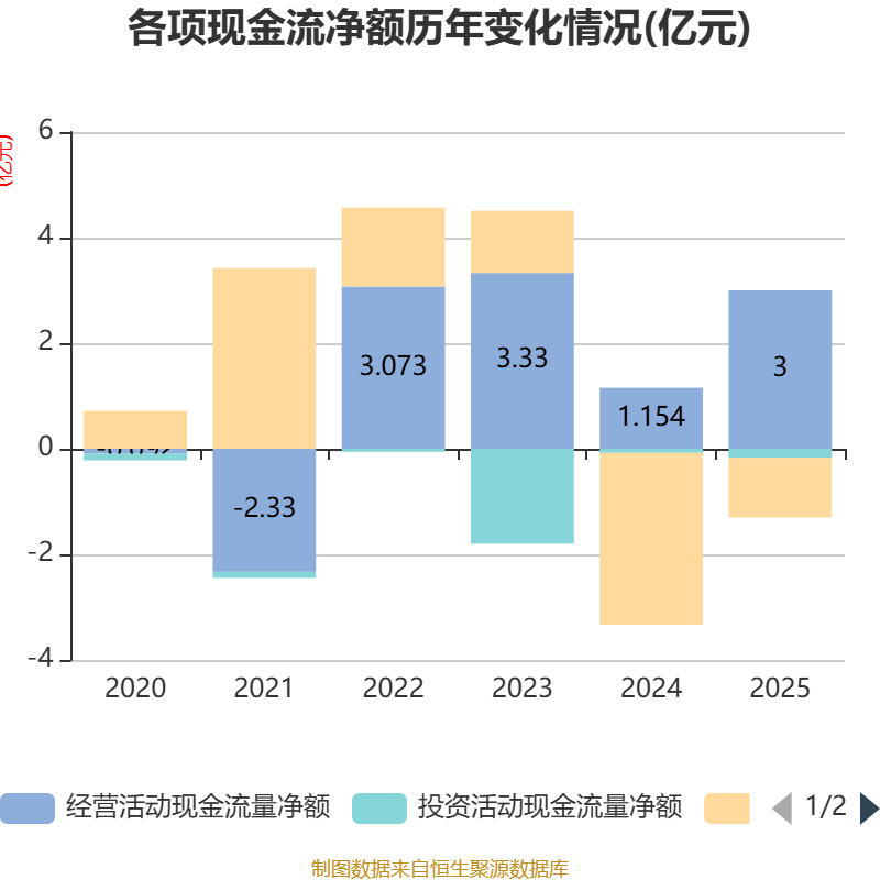截至2025年,公司经营活动现金流净额为3亿元,同比增长159.86%;筹资活动现金流净额-1.13亿元,同比增加2.12亿元;投资活动现金流净额-1702.28万元,上年同期为-789.48万元。