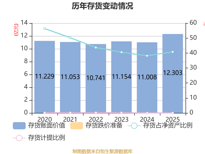 从存货变动来看,截至2025年末,公司存货账面价值为12.3亿元,占净资产的40.8%,较上年末增加1.29亿元。公司本期没有计提存货跌价准备。