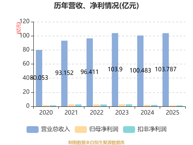 中证智能财讯人民同泰(600829)4月11日披露2025年年度报告。2025年,公司实现营业总收入103.79亿元,同比增长3.29%;归母净利润1.34亿元,同比下降37.24%;扣非净利润1.36亿元,同比下降31.44%;经营活动产生的现金流量净额为3亿元,同比增长159.86%;报告期内,人民同泰基本每股收益为0.2308元,加权平均净资产收益率为4.54%。