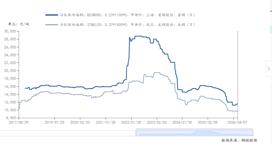 根据第一硅钢网数据,4月7日,武钢23RK085报价11600元/吨,而上年年同期该产品市场价格为15800元/吨,同比下跌约4000元/吨;同时,大厂和小厂之间的Hi-B钢现价大概有1000元左右的差价,如宝钢B23R080报价11800元/吨,湖南宏旺H23GK080报价10100-10900元/吨。