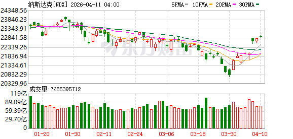 美股市场:美股三大指数04月10日收盘涨跌不一。截至收盘,道琼斯工业平均指数比前一交易日下跌269.23点,收于47916.57点,跌幅为0.56%;标准普尔500种股票指数下跌7.77点,收于6816.89点,跌幅为0.11%;纳斯达克综合指数上涨80.47点,收于22902.89点,涨幅为0.35%,录得八连涨。周线方面,纳指本周累涨4.68%,标普500指数累涨3.56%并创去年11月份以来最大单周涨幅,道指累涨3.04%。