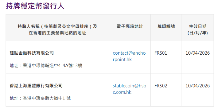 香港金管局4月10日宣布,根据《稳定币条例》向碇点金融科技及香港上海汇丰银行授予稳定币发行人牌照,以在香港发行稳定币。牌照于10日生效。根据持牌人的业务计划,待相关准备工作完成后,他们拟于未来数月内开展业务。