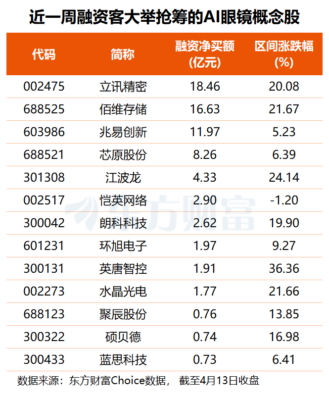 资金方面,东方财富Choice数据显示,近一周共有33只AI眼镜概念股获得千万元级融资净买入,其中,立讯精密、佰维存储、兆易创新分别获融资客大举抢筹18.46亿、16.63亿和11.97亿元,芯原股份也获杠杆资金加仓8.26亿元,江波龙、朗科科技、环旭电子、英唐智控等6股融资净买额均在1.7亿至4.4亿元之间。