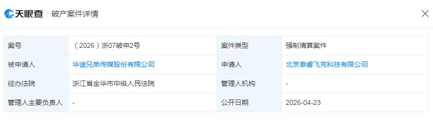 4月23日,天眼查法律诉讼信息显示,华谊兄弟传媒股份有限公司新增一则破产案件,案件类型为强制清算案件,申请人为北京泰睿飞克科技有限公司,经办法院为浙江省金华市中级人民法院。