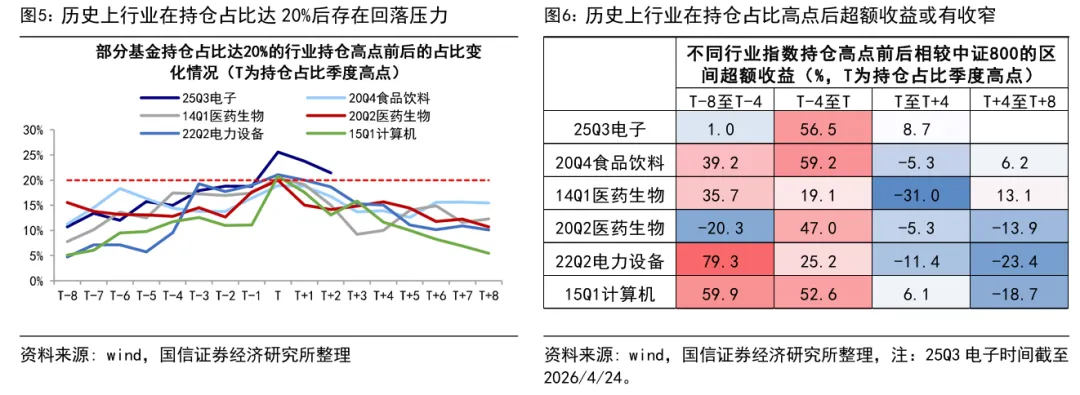 当前机构抱团现象不明显,基金持仓拥挤度或未达到极致。首先看持仓占比较高行业的集中度,历史上公募持仓单一行业的市值占比一般在超过或逼近20%后,后续往往存在筹码出清、持仓占比回落的压力,较基准的超额收益也会逐渐震荡收窄。截至26Q1,基金重仓股持仓占比超过20%的行业主要为电子(22%),电力设备(13%)、通信(13%)等行业则距离20%仍有一定空间。其次再看机构抱团现象,我们以季度主动偏股基金超配比例变化作为衡量指标,来观察基金的加仓行为,发现26Q1主动偏股基金明显加仓了约12个二级细分行业,数量处13年以来46%的中位水平,可见目前公募基金整体尚未出现在少数板块集中抱团的现象。