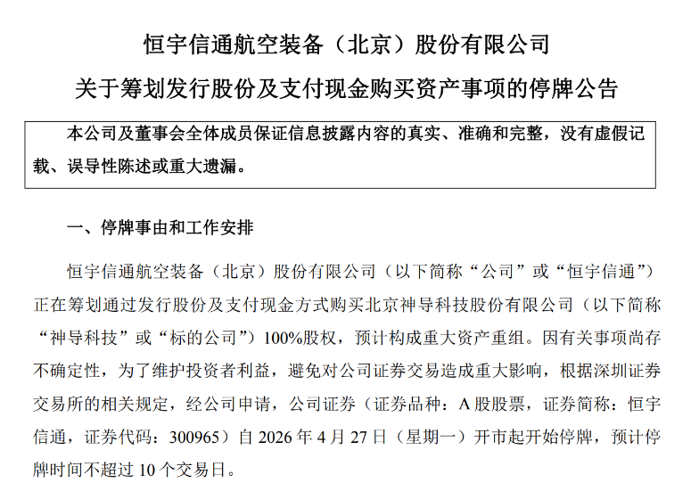 4月26日晚,恒宇信通发布公告,公司正在筹划通过发行股份及支付现金方式购买北京神导科技股份有限公司(以下简称“神导科技”)100%股权,预计构成重大资产重组。公司证券自4月27日(星期一)开市起开始停牌,预计停牌时间不超过10个交易日。