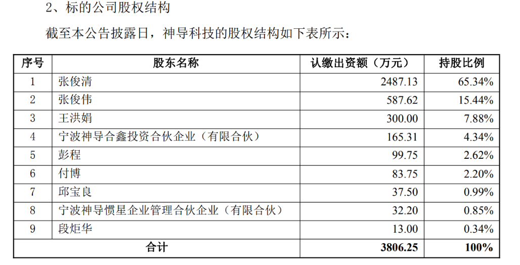 股权结构显示,神导科技实际控制人为张俊清,持股比例为65.34%,张俊清也是公司的创始人。目前,恒宇信通已与张俊清等人签署了收购意向协议,但交易对方的范围尚未最终确定。