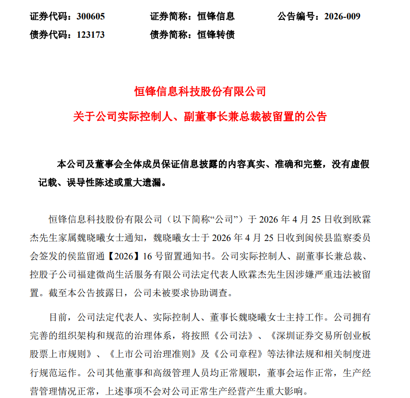 4月26日晚,恒锋信息(300605)发布公告称,公司实际控制人、副董事长兼总裁欧霖杰因涉嫌严重违法,被闽侯县监察委员会留置。