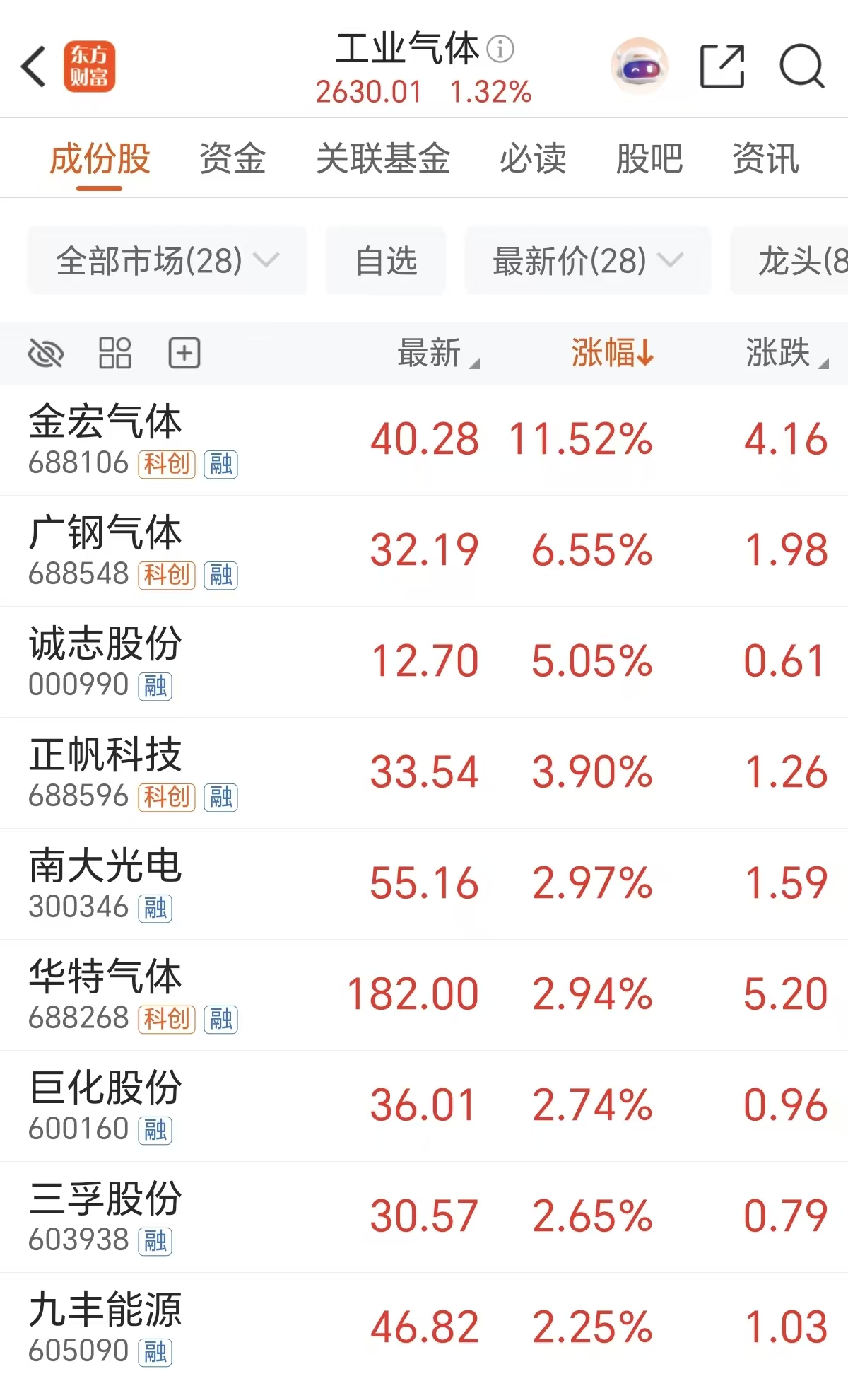 周一工业气体概念活跃,截至午间收盘,金宏气体涨超11%,广钢气体、诚志股份等涨超5%。