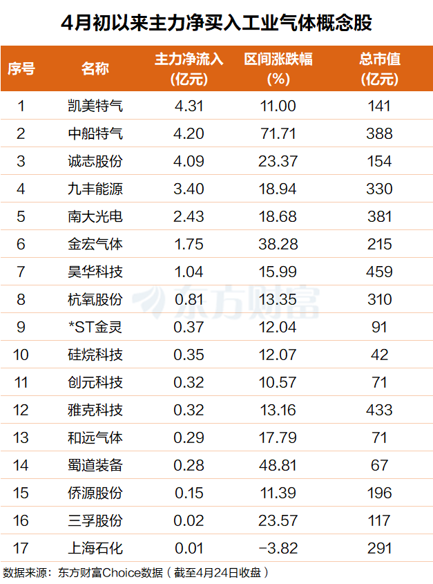 东方财富Choice数据显示,自今年4月初以来,主力资金净买入一批工业气体概念股。