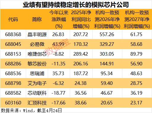 按照机构一致预测,2026年净利润增幅有望居前的分别是晶丰明源、必易微、唯捷创芯。