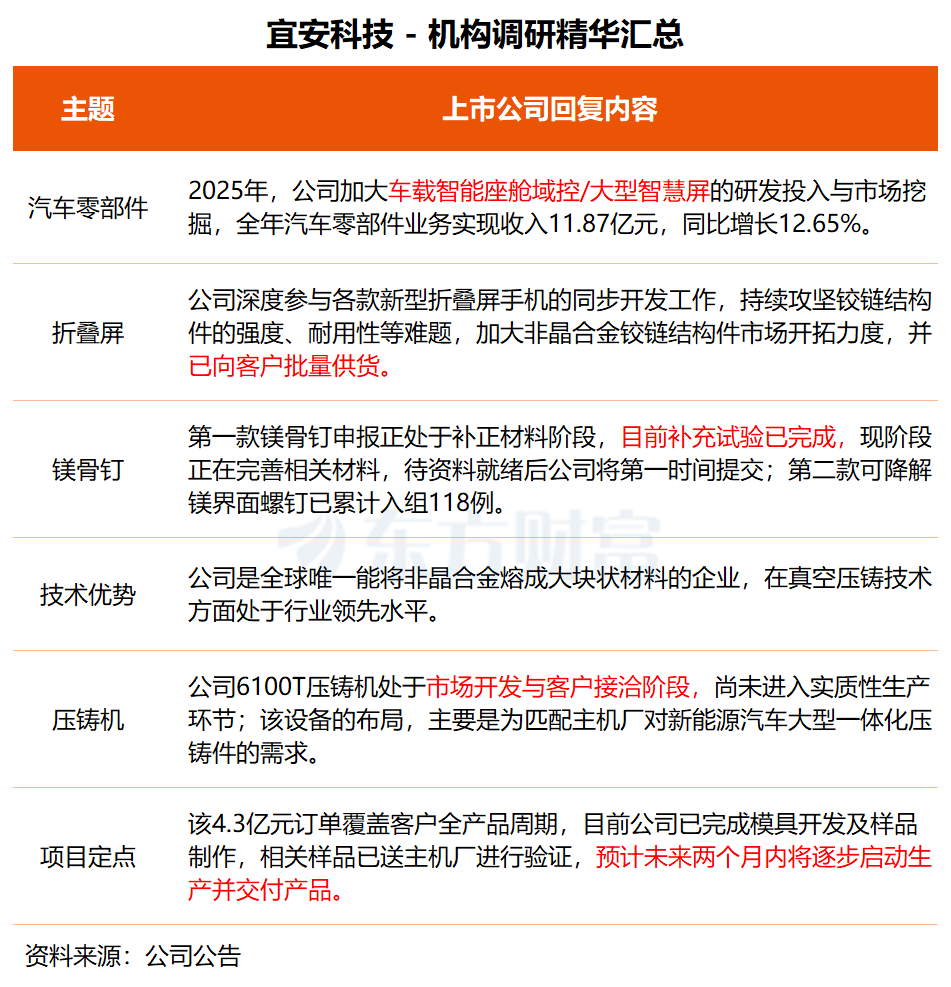 在调研中,宜安科技表示,针对折叠屏手机行业痛点,公司深度参与各款新型折叠屏手机的同步开发工作,持续攻坚铰链结构件的强度、耐用性等难题,加大非晶合金铰链结构件市场开拓力度,并已向客户批量供货。