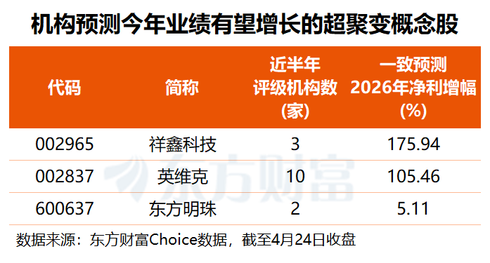 东方财富Choice数据显示,近半年共有3只超聚变概念股获得两家及以上机构给予投资评级,其中,机构预测祥鑫科技、英维克2026年净利将同比大增1.76倍和1.05倍,东方明珠今年净利将重回正增长。