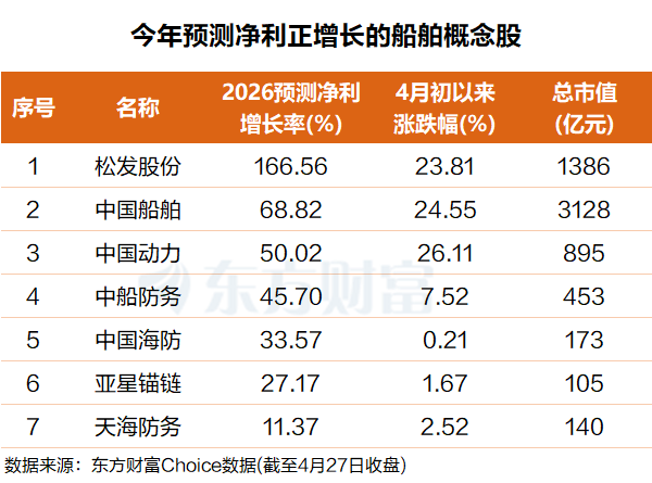 从机构预测净利润增长数据看,松发股份排名第一,今年净利润有望增长超166%;中国船舶排名第二,净利润增长有望超68%。