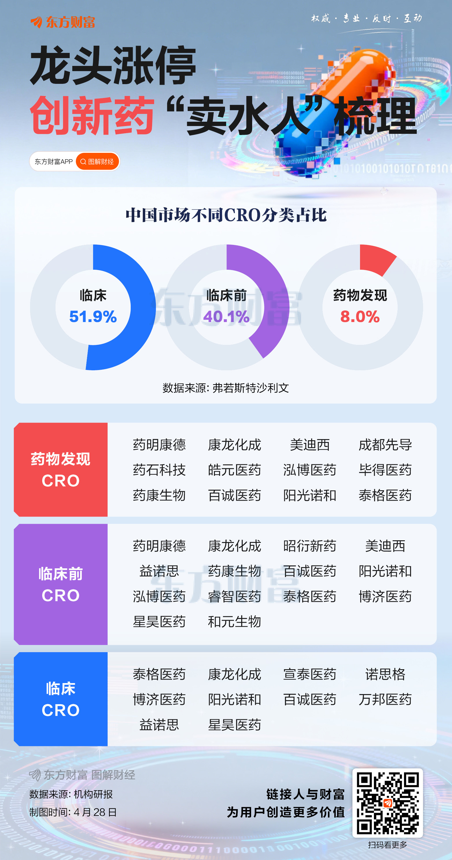 周二(4月28日)CRO概念表现活跃,龙头股药明康德、凯莱英涨停,昭衍新药、康龙化成、药康生物、药石科技等跟涨。